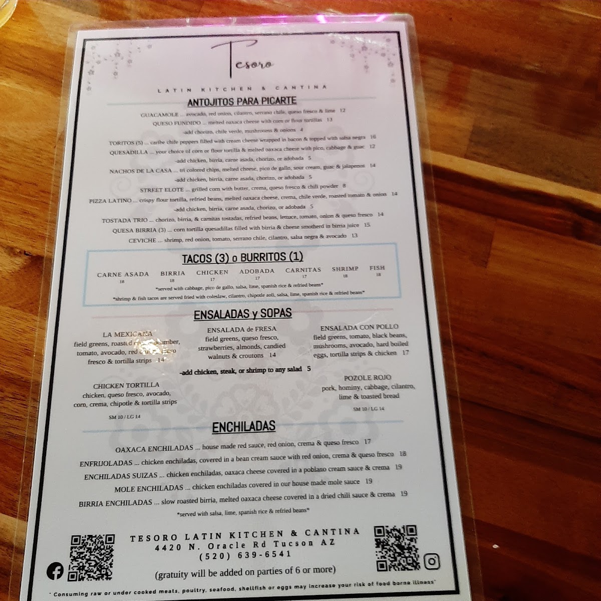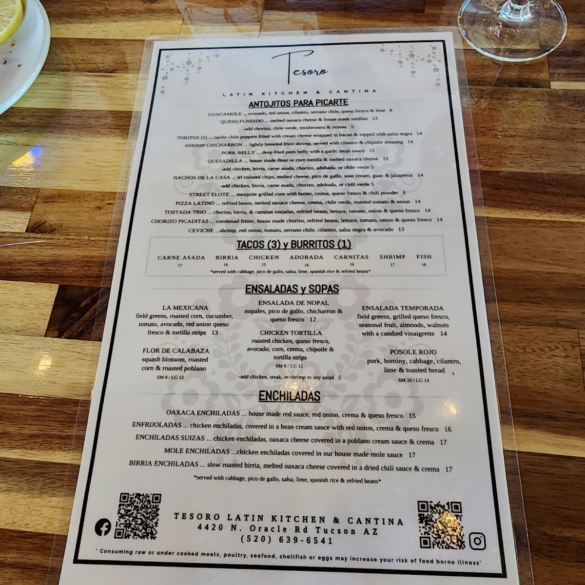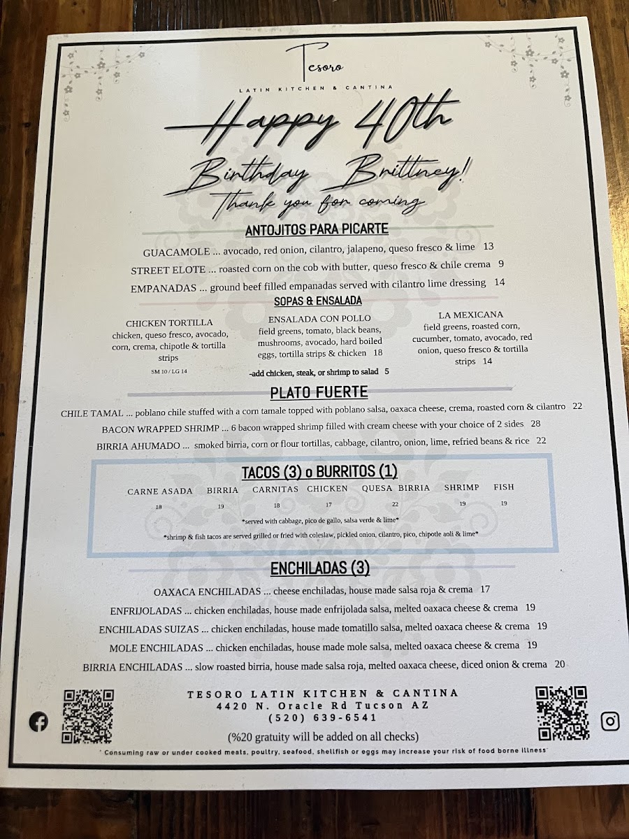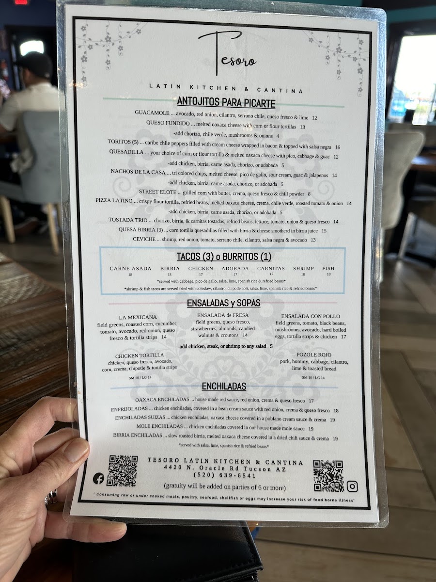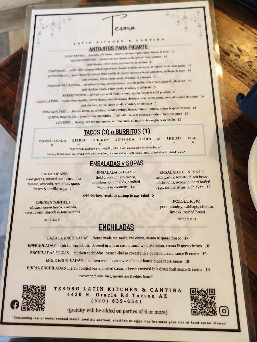 Welcome to Tesoro Latin Kitchen & Cantina, a vibrant culinary gem located at 4420 N Oracle Rd, Tucson, AZ. This delightful eatery serves up an enticing array of Latin American flavors, brilliantly showcased in dishes like the Mar y Tierra parrillada, a feast perfect for sharing. Customers rave about the complimentary chips and salsa, lauded for their delightful kick, along with the elegantly plated enchiladas and heavenly flan for dessert.